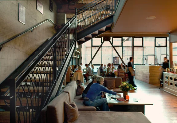 Our renovation in 2006 restored the street façade with operable transom windows over glazed roll-up garage doors. We carefully exposed the original board-formed concrete walls, wood floors and ceiling, and Douglas fir roof trusses that are up to three feet in girth. A mezzanine seating area was created above the main floor restaurant, and a section of roof was peeled off the back of the building to create a two-level terrace and a west-facing window wall that fills the interior spaces with light. The extraordinary height of the original basement allowed us to insert a new lower daylight level of retail and outdoor spaces that connect to the courtyard of the Chophouse Row project.